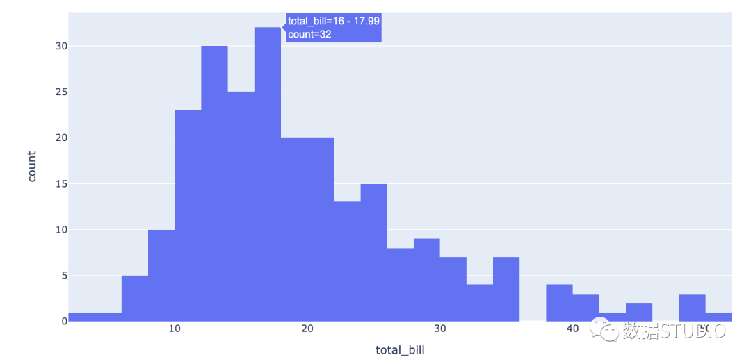 plotly code import plotly.express as px df = px.data.tips() fig = px.histogram(df, x="total_bill" ) fig.show()