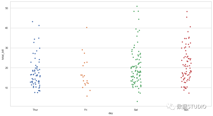 seaborn code import seaborn as sns sns.set_context({'figure.figsize' :[15 , 8 ]}) sns.set_theme(style="whitegrid" ) tips = sns.load_dataset("tips" ) ax = sns.stripplot(x="day" , y="total_bill" , data=tips)