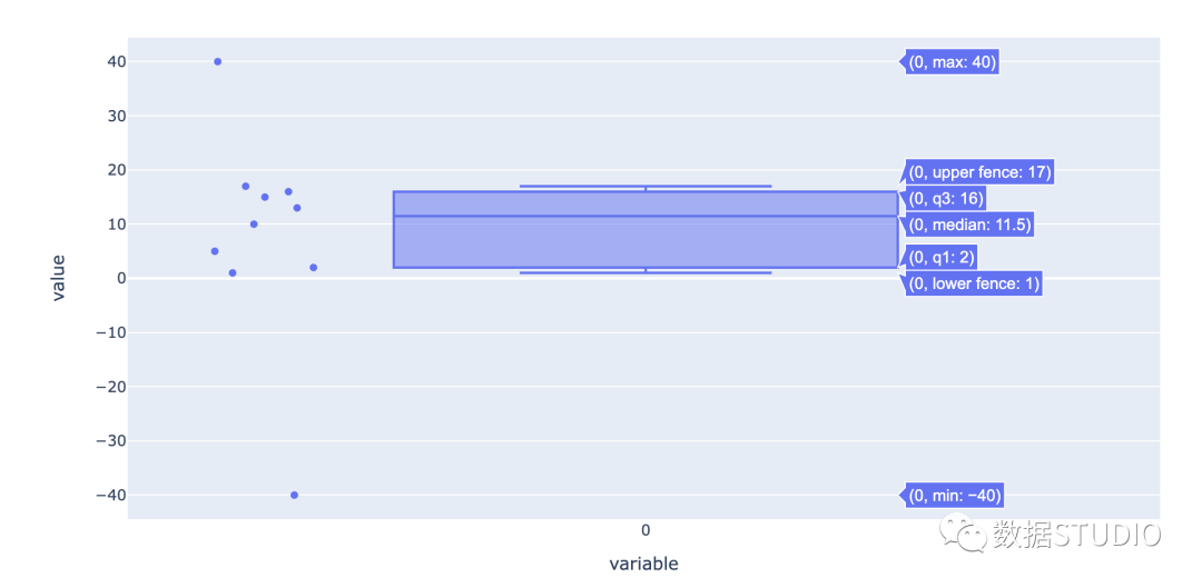 plotly code import numpy as np import plotly.express as px data = np.array([-40 ,1 ,2 ,5 ,10 ,13 ,15 ,16 ,17 ,40 ]) fig = px.box(data, points="all" ) fig.show()