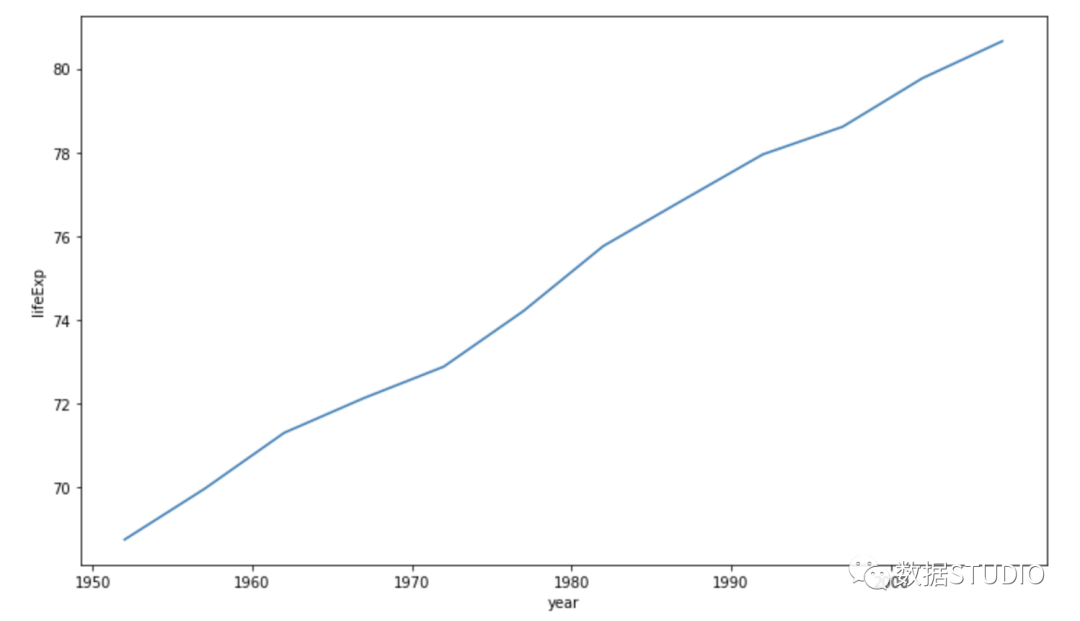 import seaborn as sns sns.lineplot(data=df, x="year" , y="lifeExp" )
