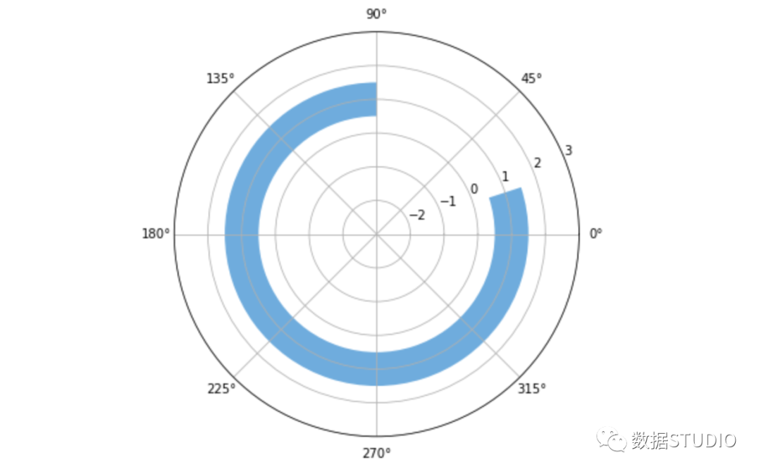 特殊的饼图 fig, ax = plt.subplots(figsize=(6 , 6 ), subplot_kw={'projection' :'polar' }) data = 80 startangle = 90 x = (data * np.pi * 2 )/ 100 left = (startangle * np.pi * 2 ) / 360 # 转换起始角度 ax.barh(1 , x, left=left, height=1 , color='#5DADE2' ) plt.ylim(-3 , 3 )
