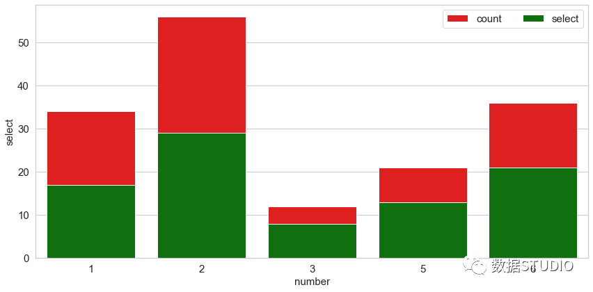 Seaborn code import pandasimport matplotlib.pylab as pltimport seaborn as sns plt.rcParams["figure.figsize" ] = [12 , 6 ] plt.rcParams["figure.autolayout" ] = True df = pandas.DataFrame(dict( number=[2 , 5 , 1 , 6 , 3 ], count=[56 , 21 , 34 , 36 , 12 ], select=[29 , 13 , 17 , 21 , 8 ] )) bar_plot1 = sns.barplot(x='number' , y='count' , data=df, label="count" , color="red" ) bar_plot2 = sns.barplot(x='number' , y='select' , data=df, label="select" , color="green" ) plt.legend(ncol=2 , loc="upper right" , frameon=True , fontsize=15 ) plt.xlabel('number' , fontsize=15 ) plt.ylabel('select' ,fontsize=15 ) plt.xticks(fontsize=15 ) plt.yticks(fontsize=15 ) plt.show()