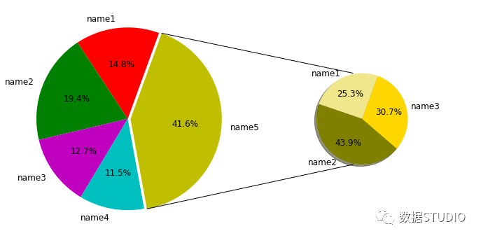 ax2 = fig.add_subplot(122 ) fig.subplots_adjust(wspace=0 )# 定义数据 data = {'category' : ['name1' , 'name2' , 'name3' , 'name4' , 'name5' ], 'quantity' : [138 , 181 , 118 , 107 , 387 ]} others = {'category' : ['name1' , 'name2' , 'name3' , ], 'quantity' : [98 , 170 , 119 ]}# 大饼图 labs = data['category' ] quantity = data['quantity' ] explode = (0 , 0 , 0 , 0 , 0.03 ) # 分裂距离 ax1.pie(x=quantity, colors=['r' , 'g' , 'm' , 'c' , 'y' ], explode=explode, autopct='%1.1f%%' , startangle=70 , labels=labs, textprops={'color' : 'k' , 'fontsize' : 12 ,})# 小饼图 labs2 = others['category' ] quantity_2 = others['quantity' ] ax2.pie(x=quantity_2, colors=['khaki' , 'olive' , 'gold' ], autopct='%1.1f%%' , startangle=70 , labels=labs2, radius=0.5 , shadow=True , textprops={'color' : 'k' , 'fontsize' : 12 , }, )# 用 ConnectionPatch 画出两个饼图的间连线 ## 饼图边缘的数据 theta1 = ax1.patches[-1 ].theta1 theta2 = ax1.patches[-1 ].theta2 center = ax1.patches[-1 ].center r = ax1.patches[-1 ].r width=0.2 # 上边缘的连线 x = r*np.cos(np.pi/180 *theta2)+center[0 ] y = np.sin(np.pi/180 *theta2)+center[1 ] con_a = ConnectionPatch(xyA=(-width/2 ,0.5 ), xyB=(x,y), coordsA='data' , coordsB='data' , axesA=ax2, axesB=ax1 )# 下边缘的连线 x = r*np.cos(np.pi/180 *theta1)+center[0 ] y = np.sin(np.pi/180 *theta1)+center[1 ] con_b = ConnectionPatch(xyA=(-width/2 ,-0.5 ), xyB=(x,y), coordsA='data' , coordsB='data' , axesA=ax2, axesB=ax1 )for con in [con_a, con_b]: con.set_linewidth(1 ) # 连线宽度 con.set_color=([0 ,0 ,0 ]) # 连线颜色 ax2.add_artist(con) # 添加连线
