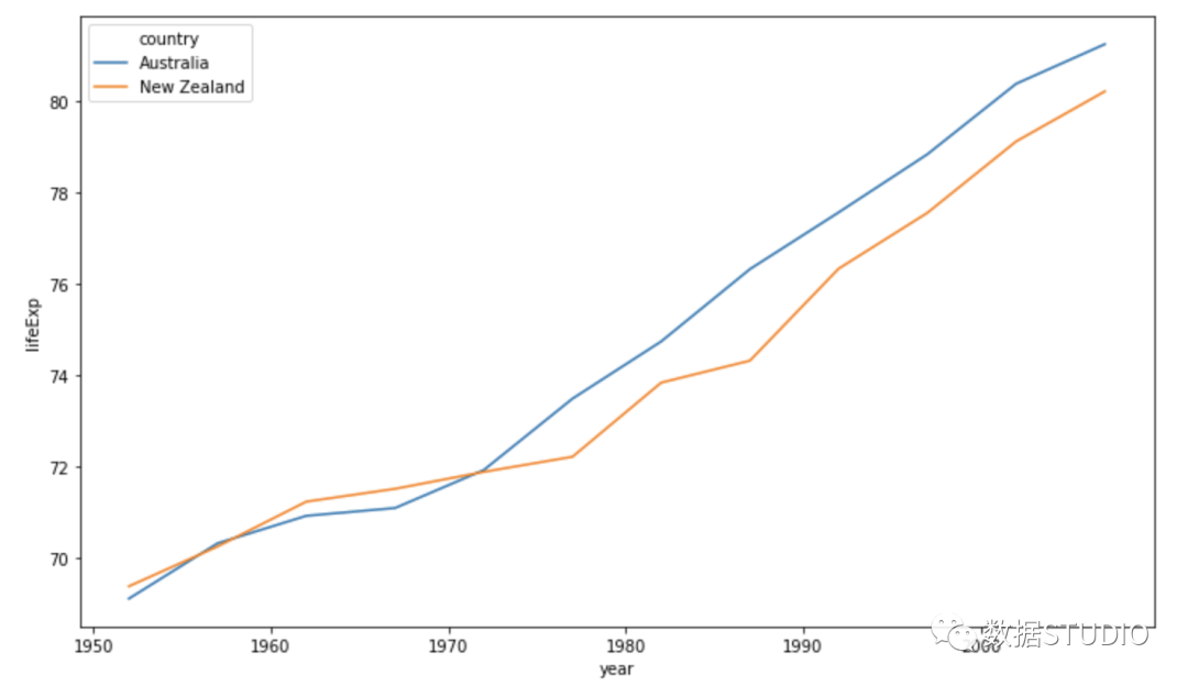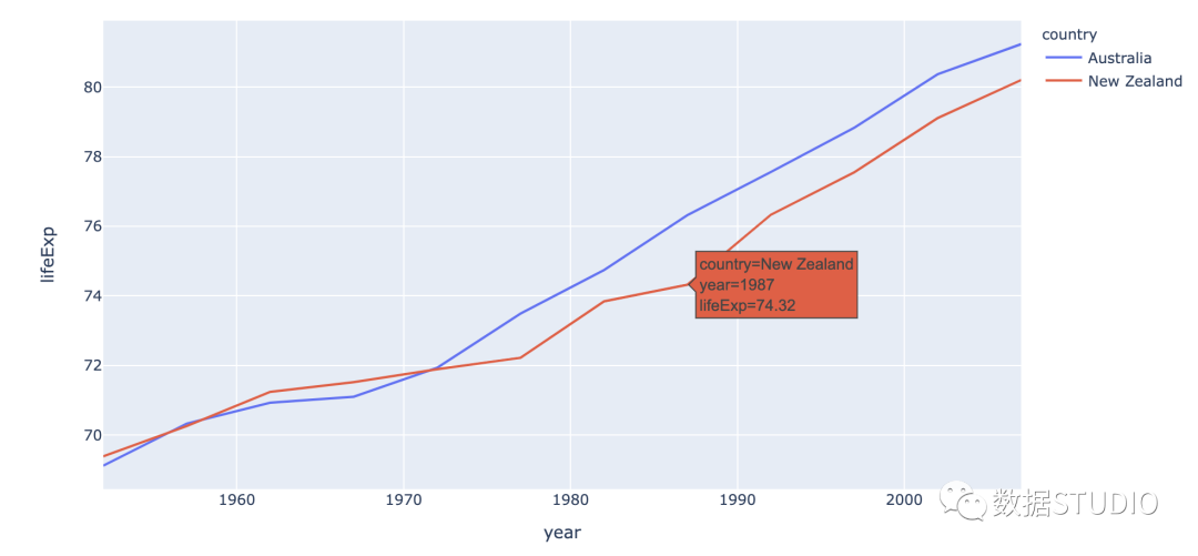 import plotly.express as px df = px.data.gapminder().query("continent == 'Oceania'" ) fig = px.line(df, x='year' , y='lifeExp'