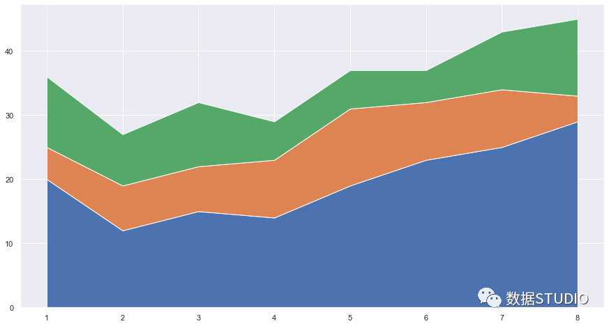 Seaborn code import pandas as pdimport matplotlib.pyplot as pltimport seaborn as sns sns.set_context({'figure.figsize' :[15 , 8 ]}) sns.set_theme() df = pd.DataFrame({'period' : [1 , 2 , 3 , 4 , 5 , 6 , 7 , 8 ], 'team_A' : [20 , 12 , 15 , 14 , 19 , 23 , 25 , 29 ], 'team_B' : [5 , 7 , 7 , 9 , 12 , 9 , 9 , 4 ], 'team_C' : [11 , 8 , 10 , 6