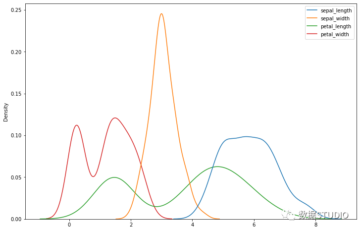 import seaborn as sns iris = sns.load_dataset("iris" ) sns.kdeplot(data=iris)