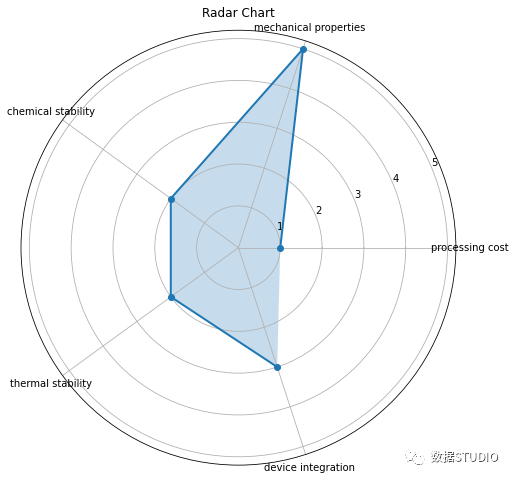 Seaborn code import pandas as pdimport seaborn as snsimport numpy as npimport matplotlib.pyplot as plt stats=np.array([1 , 5 , 2 , 2 , 3 ]) labels=['processing cost' ,'mechanical properties' ,'chemical stability' , 'thermal stability' , 'device integration' ] angles=np.linspace(0 , 2 *np.pi, len(labels), endpoint=False ) fig=plt.figure() ax = fig.add_subplot(111 , polar=True ) ax.plot(angles, stats, 'o-' , linewidth=2 ) ax.fill(angles, stats, alpha=0.25 ) ax.set_thetagrids(angles * 180 /np.pi, labels) ax.set_title("Radar Chart" ) ax.grid(True )
