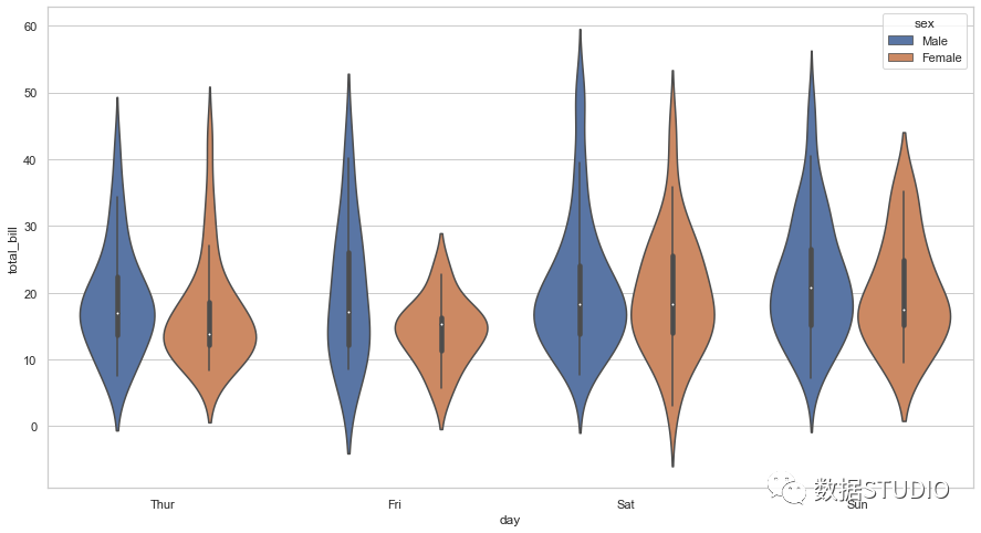 Seaborn code import seaborn as sns sns.set_context({'figure.figsize' :[15 , 8 ]}) sns.set_theme(style="whitegrid" ) tips = sns.load_dataset("tips" ) ax = sns.violinplot(x="day" , y="total_bill" , hue="sex" , data=tips)