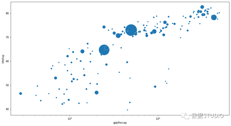 Seaborn code import matplotlib.pyplot as pltimport seaborn as snsfrom gapminder import gapminder # import data set data = gapminder.loc[gapminder.year == 2007 ] b = sns.scatterplot(data=data, x="gdpPercap" , y="lifeExp" , size="pop" , legend=False , sizes=(20 , 2000 )) b.set(xscale="log" ) plt.show()