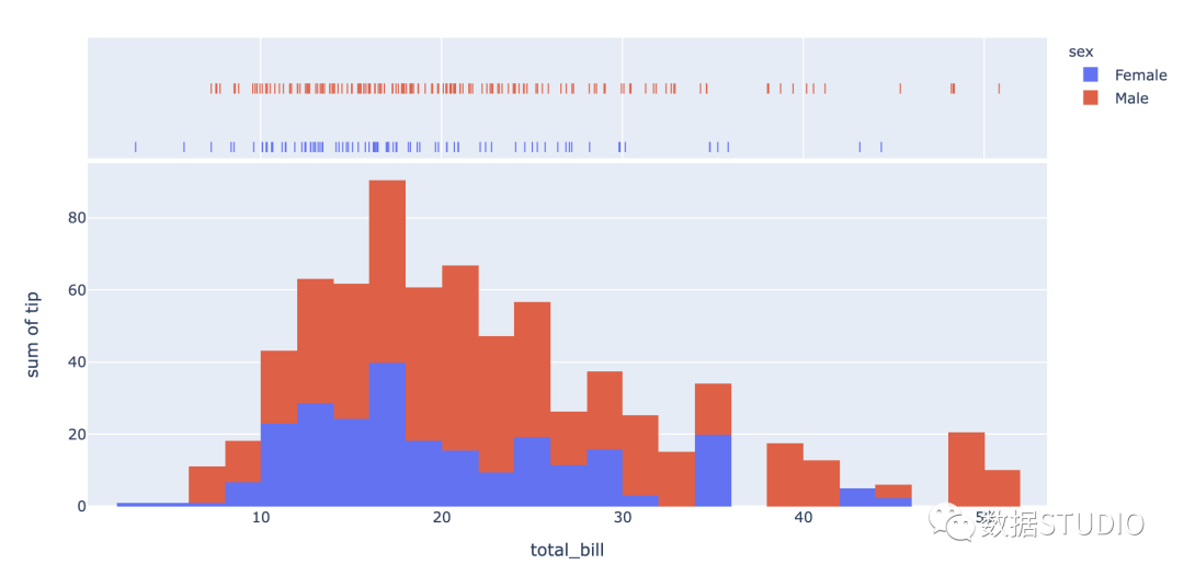 plotly code import plotly.express as px df = px.data.tips() fig = px.histogram(df, x="total_bill" , y="tip" , color="sex" , marginal="rug" , hover_data=df.columns) fig.show()