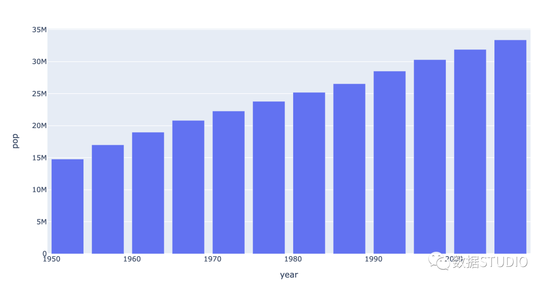 plotly code import plotly.express as px data_canada = px.data.gapminder().query("country == 'Canada'" ) fig = px.bar(data_canada, x='year' , y='pop' ) fig.show()