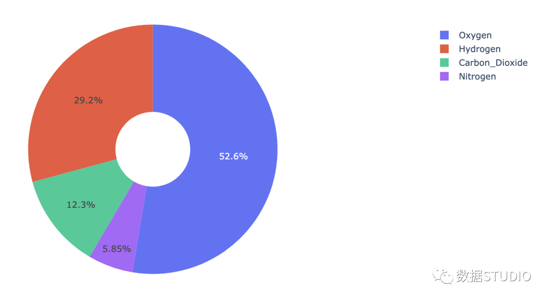 plotly code import plotly.graph_objects as go labels = ['Oxygen' ,'Hydrogen' ,'Carbon_Dioxide' ,'Nitrogen' ] values = [4500 , 2500 , 1053 , 500 ]# 使用“hole”创建一个类似甜甜圈的饼图 fig = go.Figure(data=[go.Pie(labels=labels, values=values, hole=.3 )]) fig.show()