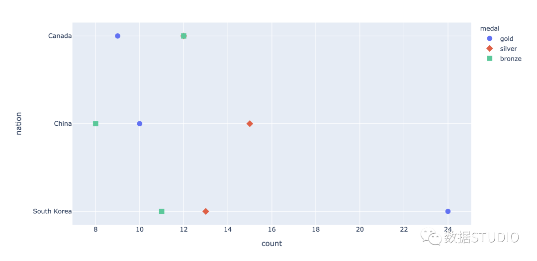 plotly code import plotly.express as px df = px.data.medals_long() fig = px.scatter(df, y="nation" , x="count" , color="medal" , symbol="medal" ) fig.update_traces(marker_size=10 ) fig.show()