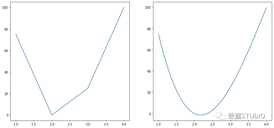 from scipy import interpolateimport numpy as npimport matplotlib.pyplot as plt fig, ax = plt.subplots(1 ,2 ,figsize=(15 ,7 )) x = np.array([1 , 2 , 3 , 4 ]) y = np.array([75 , 0 , 25 , 100 ]) ax[0 ].plot(x, y) x_new = np.linspace(1 , 4 , 300 ) a_BSpline = interpolate.make_interp_spline(x, y) y_new = a_BSpline(x_new) ax[1 ].plot(x_new, y_new)