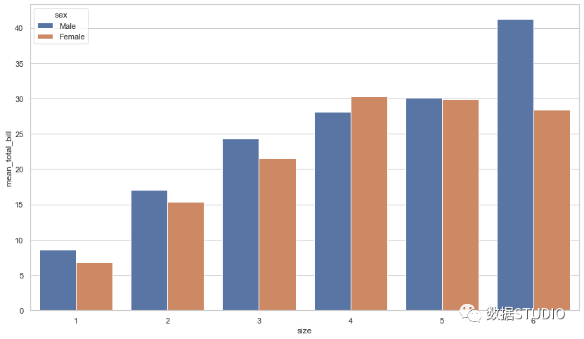 seaborn code import seaborn as sb df = sb.load_dataset('tips' ) df = df.groupby(['size' , 'sex' ]).agg(mean_total_bill=("total_bill" , 'mean' )) df = df.reset_index() sb.barplot(x="size" , y="mean_total_bill" , hue="sex" , data=df)