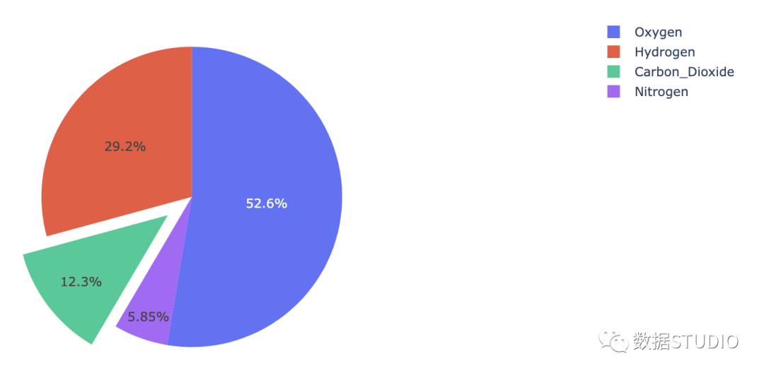 import plotly.graph_objects as golabels = ['Oxygen' ,'Himport plotly.graph_objects as go labels = [' Oxygen',' Hydrogen', ' Carbon_Dioxide',' Nitrogen'] values = [4500, 2500, 1053, 500] # 拉力是扇形半径的一个分数 fig = go.Figure(data=[go.Pie(labels=labels, values=values, pull=[0, 0, 0.2, 0])]) fig.show()