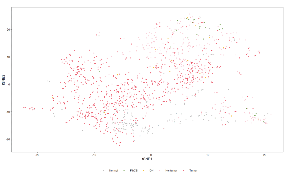 scale_colour_manual(name="", values = c('Normal' = '#b3b2b2', 'FibCS' = '#528828', 'DN' = '#f2ae0e', 'Nontumor' = '#f5c2cf', 'Tumor' = '#e8495b')) +