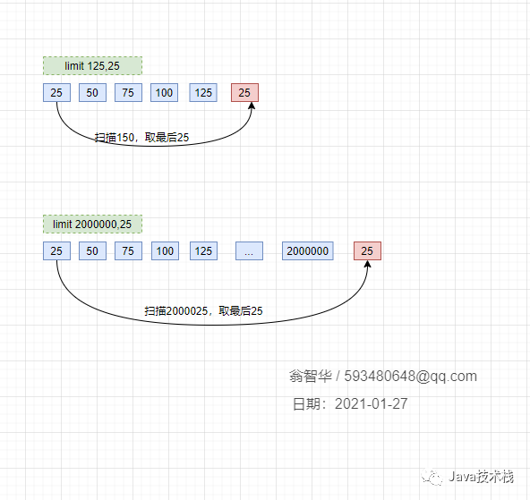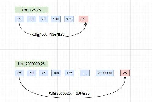 1 /*记住了上次的分页的最后一条数据的id是100,这边就直接跳过100,从101开始扫描表*/ 2 SELECT a.id,a.empno,a.empname,a.job,a.sal,b.depno,b.depname 3 from emp a left join dep b on a.depno = b.depno 4 where a.id > 100 order by a.id limit 25; 5 6 /*记住了上次的分页的最后一条数据的id是4800000,这边就直接跳过4800000,从4800001开始扫描表*/ 7 SELECT a.id,a.empno,a.empname,a.job,a.sal,b.depno,b.depname 8 from emp a left join dep b on a.depno = b.depno 9 where a.id > 4800000 10 order by a.id limit 25;