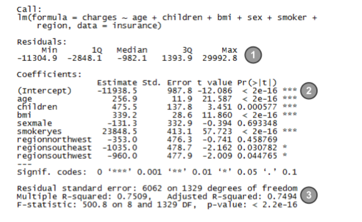 标志①:残差部分:提供了我们预测中的错误的汇总统计数据,其中一些显然是相当可观的。由于残差等于真值减去预测值,最大误差29992.8表明,该模型至少有一次观测的预测费用低了近30,000美元。另一方面,50%的误差在1Q和3Q值(第一和第三个四分之一)内,因此大部分预测在真实价值的2850美元和真实价值的1400美元之间。标志②:星形(例如“***”)表示模型中每个特征的预测能力。显著性水平(如符号所列出的)提供了一个关于给定估计值的真实系数为零的可能性的度量。三颗星的存在表明其显著性水平为0, 这意味着该特征极不太可能与因变量无关。一种常见的做法是使用0.05的显著性水平来表示一个具有统计学意义的变量