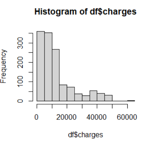 hist(df$charges)#可以很清楚的看到我们的因变量并不符合正态分布,但是我们仍然可以进行线性回归(大样本)