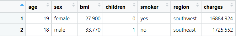 #准备输入数据#数据中共有六个维度:age(年龄),sex(性别),bmi(肥胖指数),children(孩子数量),smoker(是否吸烟),region(居住地),charges则是当前数据人上年度在医院的花销library(data.table)df