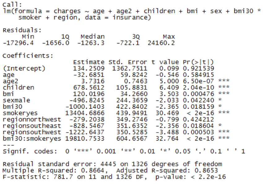 # (Intercept) age children bmi sexmale # -11938.5 256.9 475.5 339.2 -131.3 # smokeryes regionnorthwest regionsoutheast regionsouthwest # 23848.5 -353.0 -1035.0 -960.1