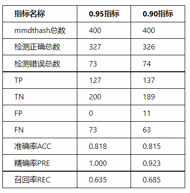 1、本次统计测试中,相似度取两个阈值进行对比,大于0.95(和0.90),则才判定为真(恶意);否则判定为假(干净)。2、KNN模型、测试文件集都是多标签的,在实际使用中等价于多分类,所以本次统计测试中,在判定为恶意的前提下,还需要预测标签与实际标签一致,才可判定为TP。此种情况下统计出的准确率、精确率、召回率等会低于二分类(非白即黑)的统计情况。