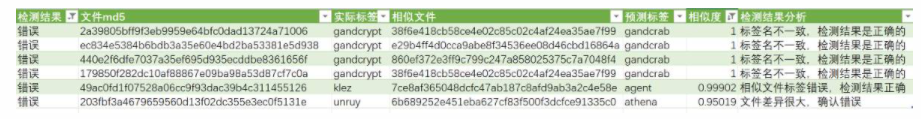 相似度等于1的错误:gandcrypt和gandcrab属于同一个恶意家族的不同名称,相似度等于1的此类检测结果正确;