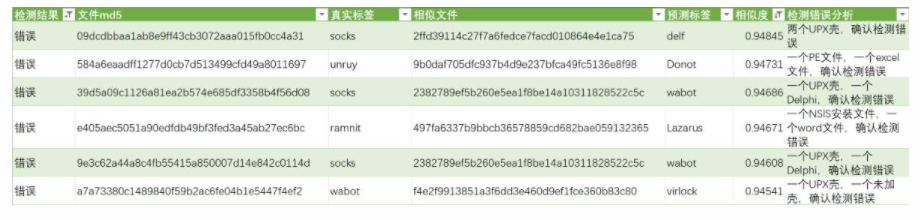 相似度大于0.94,小于0.95的错误:检测结果确认全部错误,如将UPX壳的文件和Delphi编译文件关联,将NSIS文件和word文件关联,将PE文件和excel文件关联;