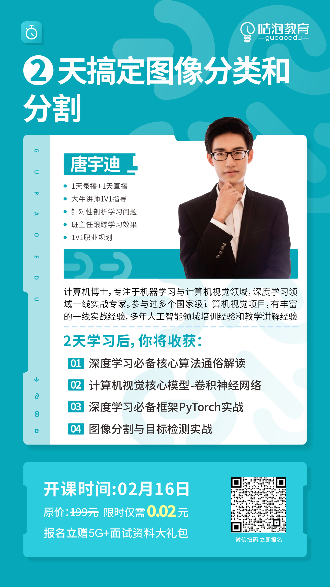 那么为了让大家更好地掌握 图像分类和分割 ,邀请人工智能实战专家唐宇迪博士。专为深度学习的同学开设了『图像分类与分割』特训营。帮助学习背后根本原理和调试代码程序的方式与思路,提升解决实际问题的能力。