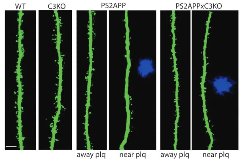 斑块附近树突棘密度的降低,以及 C3KO 小鼠树突棘密度的恢复。这些研究结果表明,降低补体活性可能是一种有效的治疗策略。
