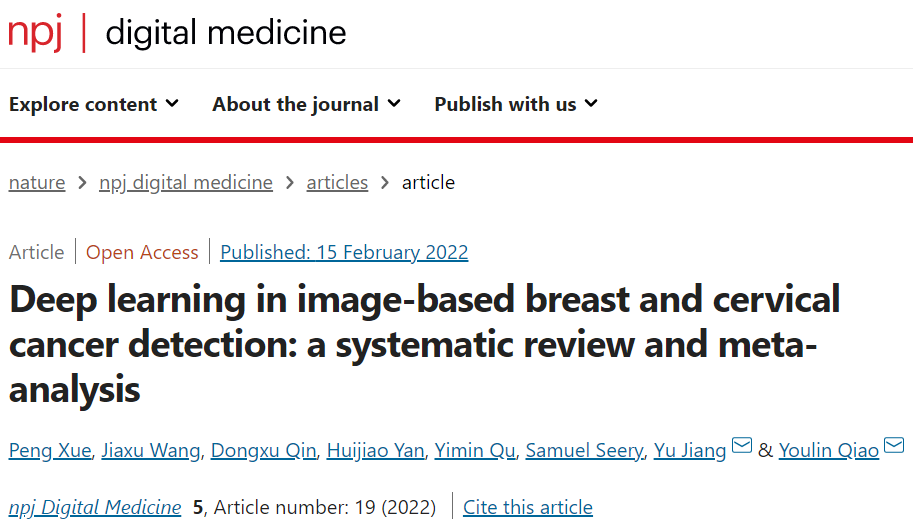 1. Xue P, Wang J, Qin D, et al. Deep learning in image-based breast and cervical cancer detection: a systematic review and meta-analysis. Nature Digit. Med. 2022; 5:19.