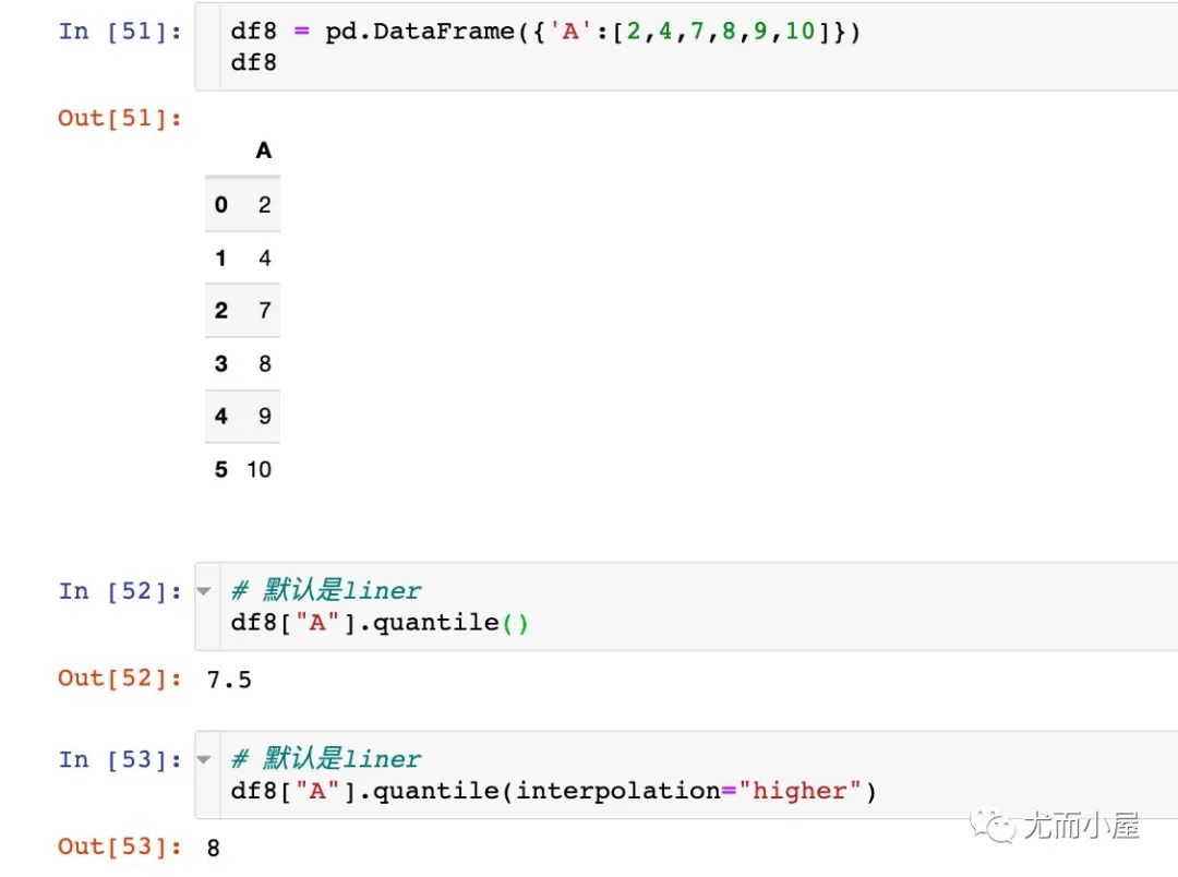 - interpolation(插值方法):可以是 {‘linear’, ‘lower’, ‘higher’, ‘midpoint’, ‘nearest’}之一,默认是linear。