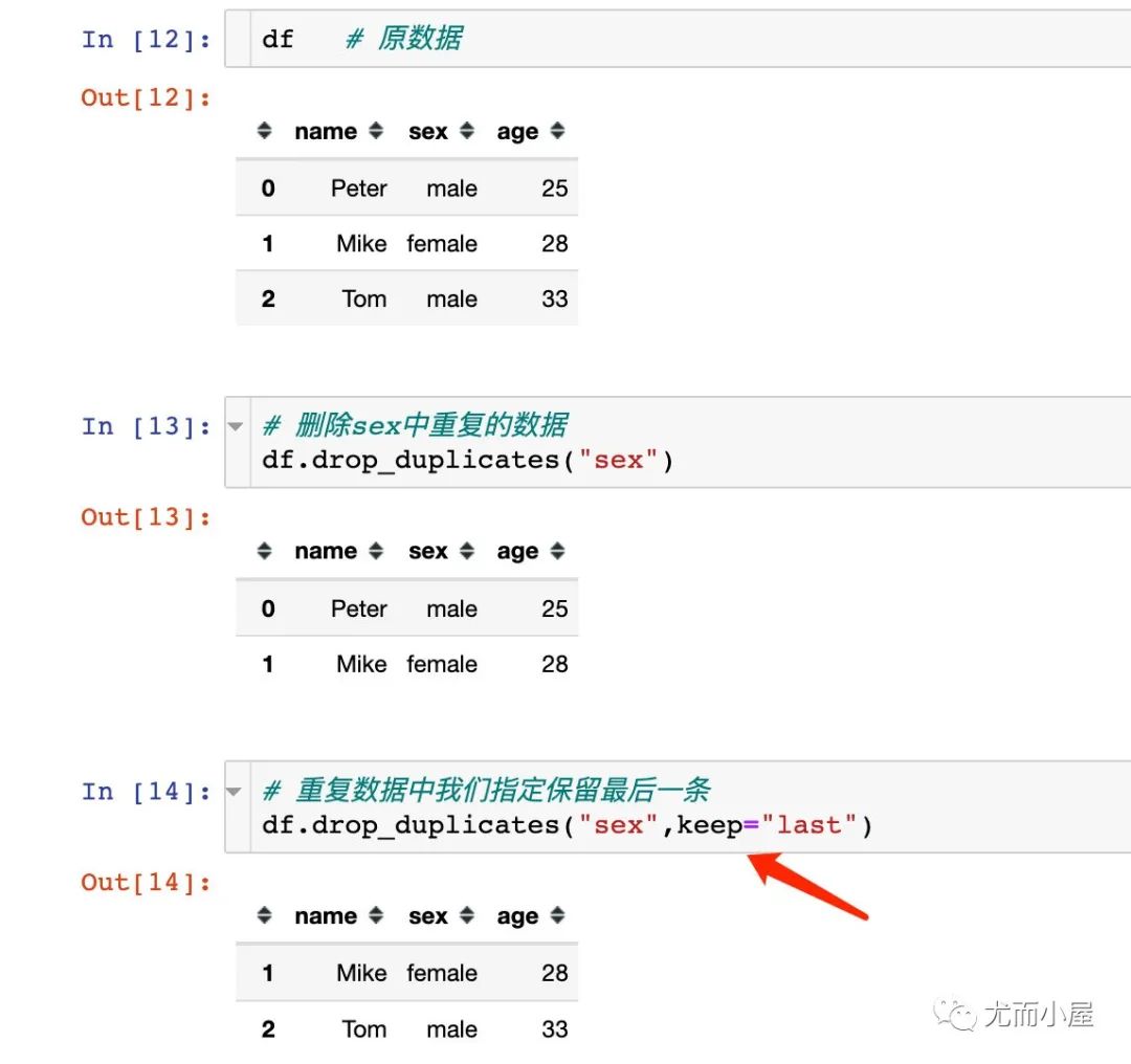 在删除数据的时候,默认保留的是第一条重复的数据,我们可以通过参数keep来指定保留最后一条