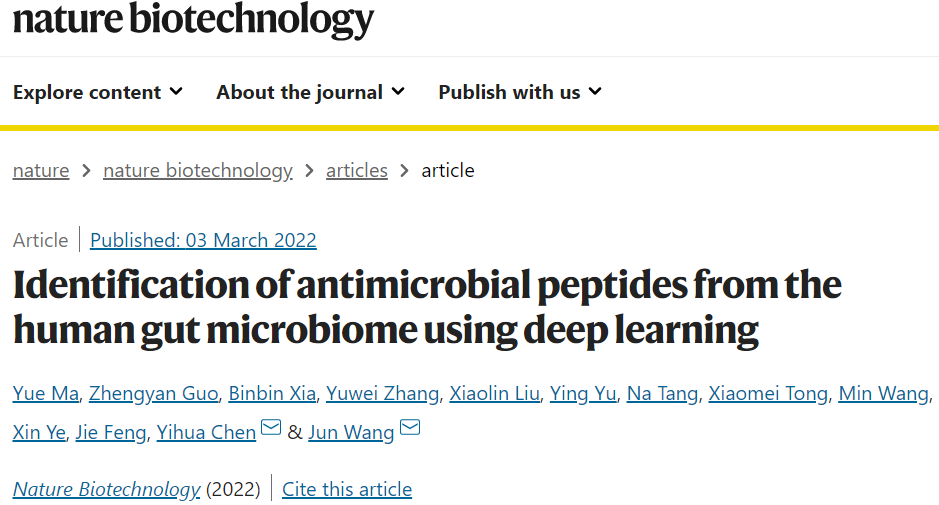 2022年3月3日,中国科学院微生物研究所王军及陈义华共同通讯在Nature Biotechnology 在线发表题为“Identification of antimicrobial peptides from the human gut microbiome using deep learning”的研究论文,该研究结合了多个自然语言处理神经网络模型,包括 LSTM、Attention 和 BERT,形成了一个统一的管道,用于从人类肠道微生物组数据中识别候选 AMP。