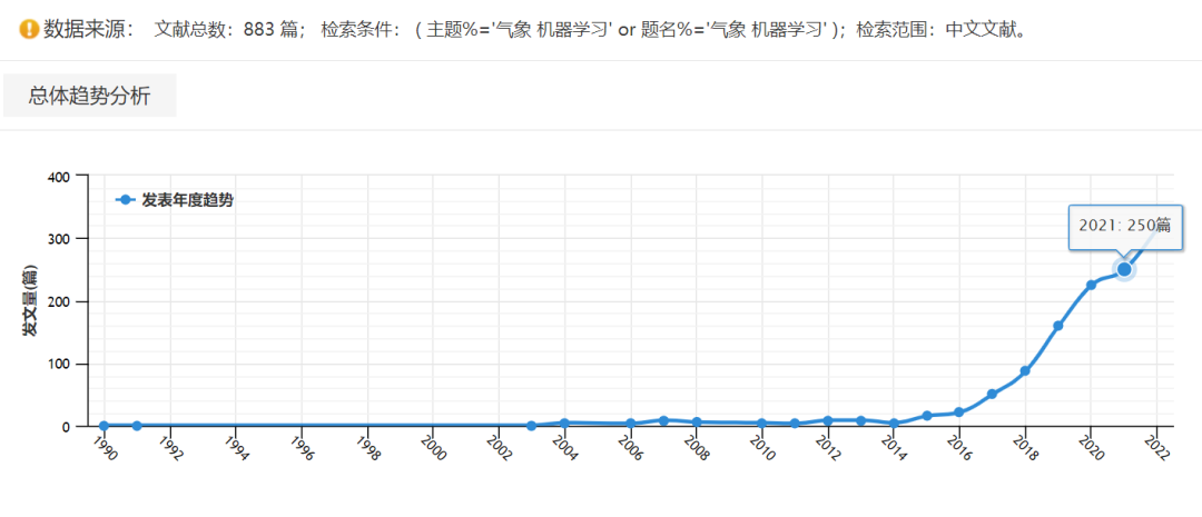 知网检索“气象 机器学习”关键词发文量年度趋势图