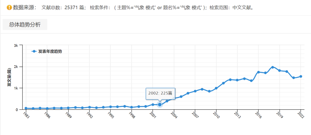 知网检索“气象 模式”关键词发文量年度趋势图