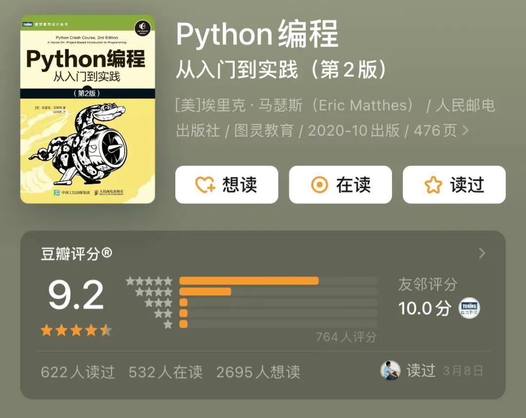 但如果,你想进一步探究Python学爬虫,推荐大家阅读这本《Python 3网络爬虫开发实战(第2版)》,豆瓣评分9.0,畅销10万+,Python 之父 Guido van Rossum力荐的爬虫入门第一书。最后,B站的up主Master_lisa为本书录制随书教程:https://www.bilibili.com/video/BV19t411m7uU?from=search&seid=17566911170300992215&spm_id_from=333.337.0.0,有需要的同学可以配合视频一起学习。书中推荐的编辑器不好用,建议新手安装pycharm,结合ananconda一起用。
