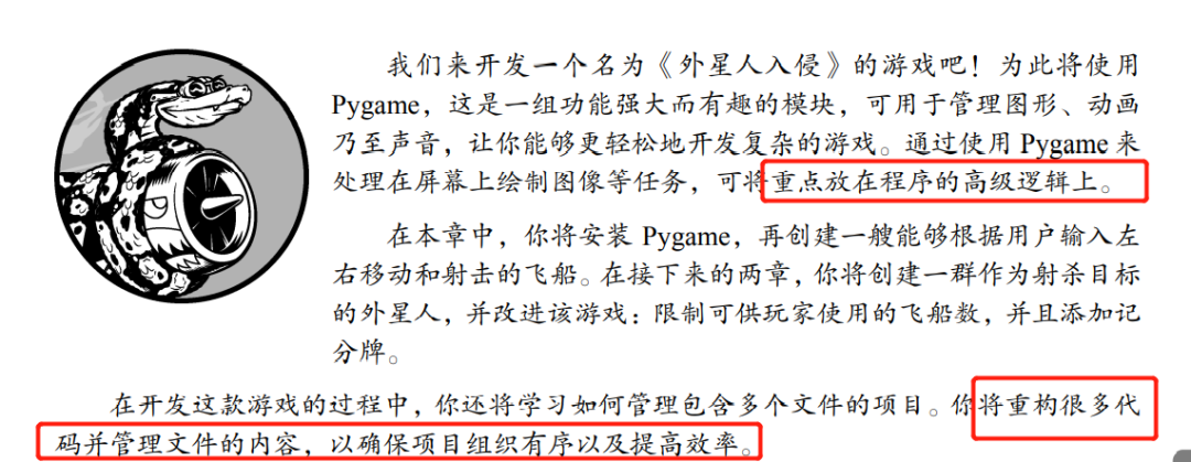 简单来讲,编程中的这种Debug能力,影响了你学习其他知识的方式,更易找到问题到底出在哪。学习最有效的时候,就是学习者占主导地位的时候。所以,你需要目标明确找到自己真正感兴趣的点。本书“项目部分”包含三个不同类型项目,游戏开发、数据可视化、web应用程序(开发自己的网站),三个项目基本覆盖了Python的主流应用方向。外星人入侵:你将使用 Pygame 包来开发一款 2D 游戏。它在玩家每消灭一群向下移动的外星人后,将玩家提高一个等级。等级越高,游戏的节奏越快,难度越大。