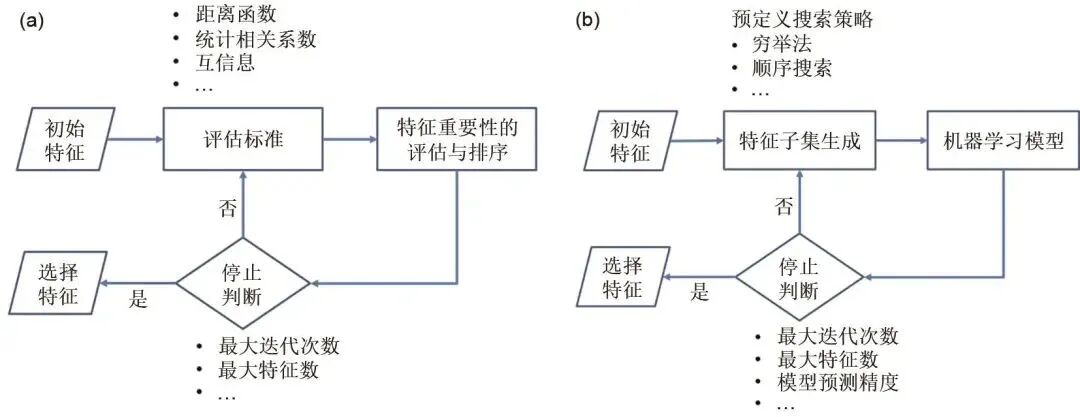 图4 特征选择方法工作流程:(a) 过滤式;(b) 包裹式