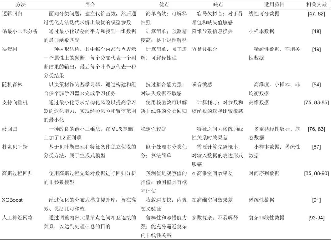 目前,机器学习在储能电池领域得到了广泛的应用,其优越性在时间效率和预测精度上都得到了证明。其中,各种算法具有不同的特点和适应范围,选择合适的机器学习算法是构建机器学习模型的关键步骤,这极大地影响了其预测的准确性和泛化能力。当前常用于储能电池研发的机器学习方法如表2所示。下面介绍这些方法在储能电池应用中的最新进展。