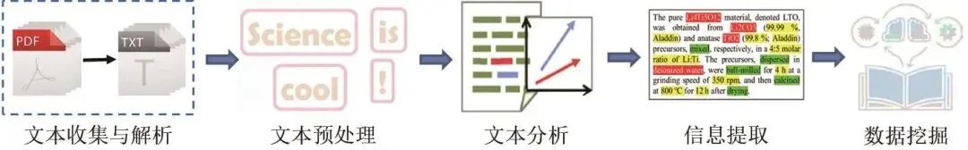 文本挖掘是指从文本语料库中提取有价值信息和知识的方法。近年来,材料科学的文本挖掘主要依靠自然语言处理技术和机器学习方法,从数量庞大且不断增长的科学出版物中快速获取非结构化科学知识,进而指导材料相关领域的研究。文本挖掘的工作流程可以概括为文本收集与解析、文本预处理、文本分析、信息提取、数据挖掘,如图7所示。随着文本挖掘技术的逐渐成熟,已有学者将其应用到电化学储能材料领域,从而追踪材料研究动态、指导材料合成和建立材料数据库等。