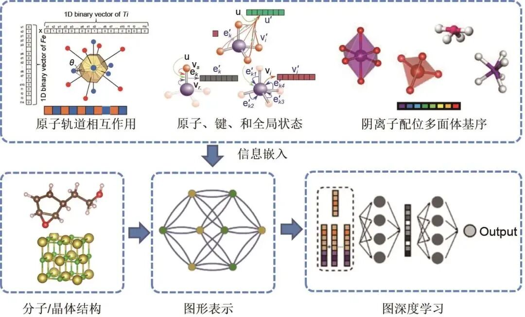 起初,图深度学习被应用在分子体系的性能预测中,随后被用于周期性晶体体系。工作流程如图6所示,首先需要获取材料结构数据集,一般来源于ICSD数据库或CSD数据库;然后对材料结构进行图形表示,这个过程需要选择合适的材料信息进行编码,如原子轨道相互作用、原子属性、键属性、全局状态和阴离子配位多面体基序等;最后通过图深度学习模型预测材料性能。这里总结了不同材料信息嵌入下图深度学习在材料性能预测中的应用。