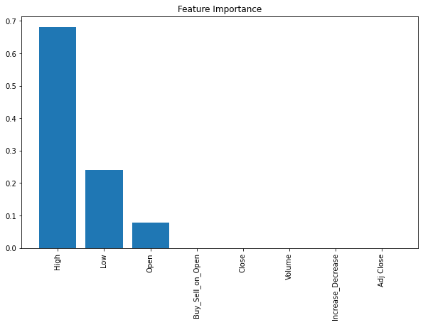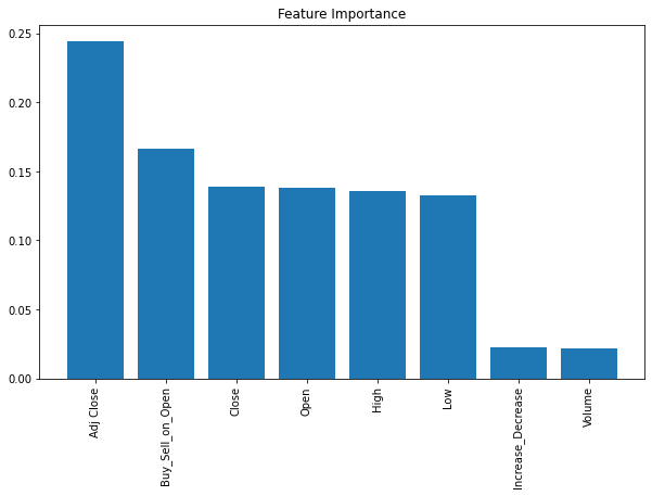 棵树,那么对于特征X的重要性 ,之所以可以用这个表达式来作为相应特征的重要性的度量值是因为:若给某个特征随机加入噪声之后,袋外的准确率大幅度降低,则说明这个特征对于样本的分类结果影响很大,也就是说它的重要程度比较高。 连续型特征重要性 对于连续型任务的特征重要性,可以使用回归模型RandomForestRegressor 中feature_importances_属性。 X_1 = dataset[['Open' , 'High' , 'Low' , 'Volume' , 'Increase_Decrease' ,'Buy_Sell_on_Open' , 'Buy_Sell' , 'Returns' ]] y_1 = dataset['Adj Close' ]# 创建决策树分类器对象 clf = RandomForestRegressor(random_state=0 , n_jobs=-1 )# 训练模型 model = clf.fit(X_1, y_1)# 计算特征重要性 importances = model.feature_importances_# 按降序排序特性的重要性 indices = np.argsort(importances)[::-1 ]# 重新排列特性名称,使它们与已排序的特性重要性相匹配 names = [dataset.columns[i] for i in indices]# 创建画布 plt.figure(figsize=(10 ,6 ))# 添加标题 plt.title("Feature Importance" )# 添加柱状图 plt.bar(range(X.shape[1 ]), importances[indices])# 为x轴添加特征名 plt.xticks(range(X.shape[1 ]), names, rotation=90 ) 分类型特征重要性 当该任务是分类型,需要用分类型模型时,可以使用RandomForestClassifier 中的feature_importances_属性。 X2 = dataset[['Open' , 'High' , 'Low' ,'Adj Close' , 'Volume' , 'Buy_Sell_on_Open' , 'Buy_Sell' , 'Returns' ]] y2 = dataset['Increase_Decrease' ] clf = RandomForestClassifier(random_state=0 , n_jobs=-1 ) model = clf.fit(X2, y2) importances = model.feature_importances_ indices = np.argsort(importances)[::-1 ] names = [dataset.columns[i] for i in indices] plt.figure(figsize=(10 ,6 )) plt.title("Feature Importance" ) plt.bar(range(X2.shape[1 ]), importances[indices]) plt.xticks(range(X2.shape[1 ]), names, rotation=90 ) plt.show() 本案例中使用回归模型