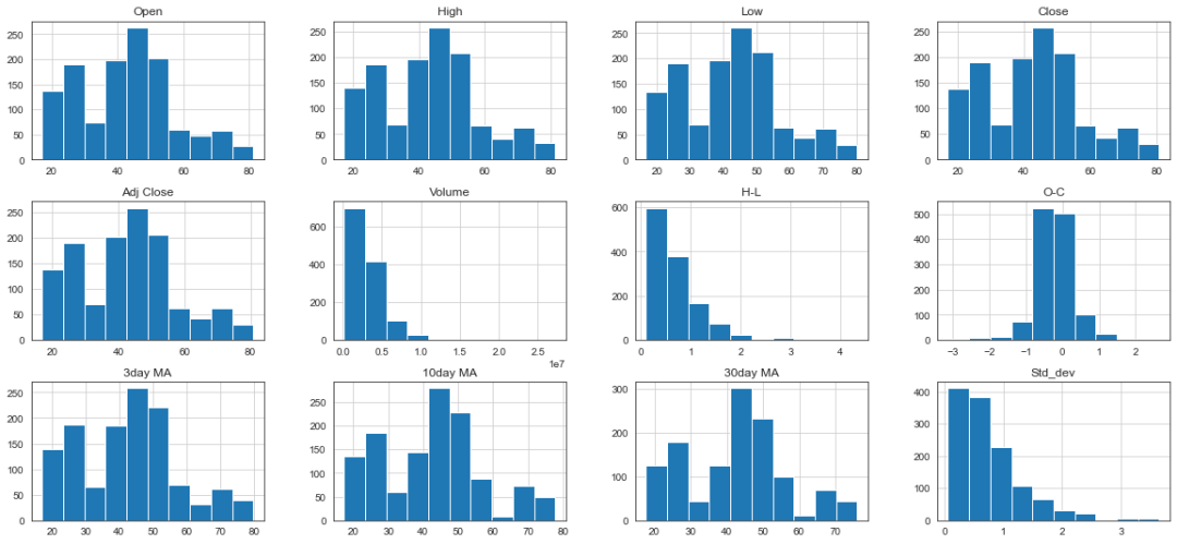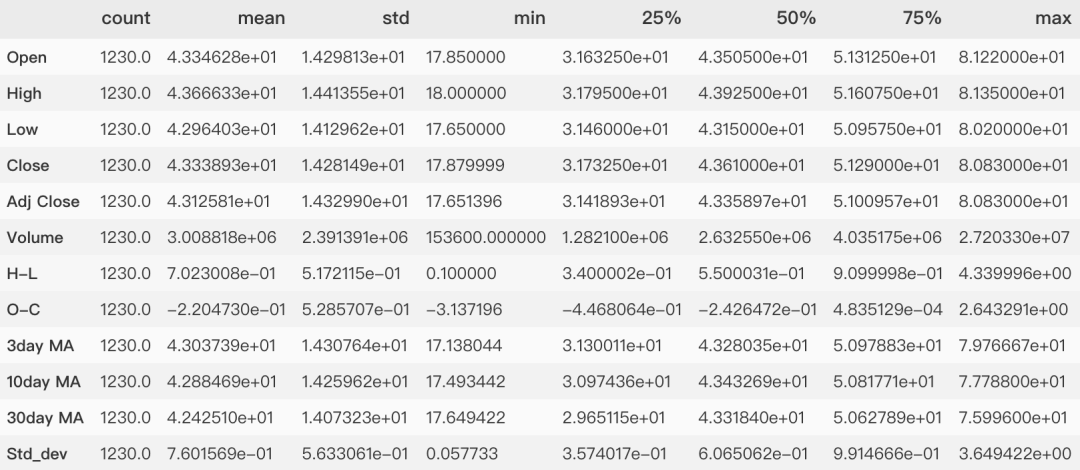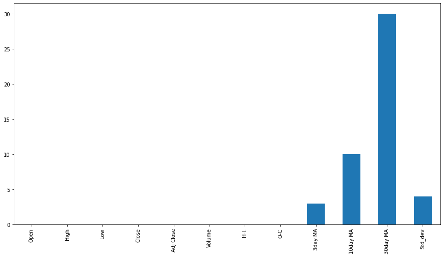 本文主要从股市数据变量的特征分布及特征重要性 两个角度对数据进行分析。 通过绘制图表等方法分析特征本身对分布状况或特征间相互关系。通过机器学习模型方法分析出特种重要性排序,选出对结果贡献较大对那几个特征,这对后面建模对模型效果有着不可小觑对效果。 数据准备 DatetimeIndex: 1260 entries, 2015-12-31 to 2020-12-31 Data columns (total 6 columns): # Column Non-Null Count Dtype --- ------ -------------- ----- 0 Open 1260 non-null float64 1 High 1260 non-null float64 2 Low 1260 non-null float64 3 Close 1260 non-null float64 4 Adj Close 1260 non-null float64 5 Volume 1260 non-null int64 dtypes: float64(5), int64(1) memory usage: 68.9 KB特征构造 df['H-L' ] = df['High' ] - df['Low' ] df['O-C' ] = df['Adj Close' ] - df['Open' ] df['3day MA' ] = df['Adj Close' ].shift(1 ).rolling(window=3 ).mean() df['10day MA' ] = df['Adj Close' ].shift(1 ).rolling(window=10 ).mean() df['30day MA' ] = df['Adj Close' ].shift(1 ).rolling(window=30 ).mean() df['Std_dev' ] = df['Adj Close' ].rolling(5 ).std() df.dtypes 描述性统计 缺失值分析 检查缺失值 Open 0 High 0 Low 0 Close 0 Adj Close 0 Volume 0 H-L 0 O-C 0 3day MA 3 10day MA 10 30day MA 30 Std_dev 4 dtype: int64 缺失值可视化 这里使用Series的属性plot直接绘制条形图。 df_missing_count = df.isnull().sum() # -1表示缺失数据 # 另一个不常见的设置画布的方法 plt.rcParams['figure.figsize' ] = (15 ,8 ) df_missing_count.plot.bar() plt.show()