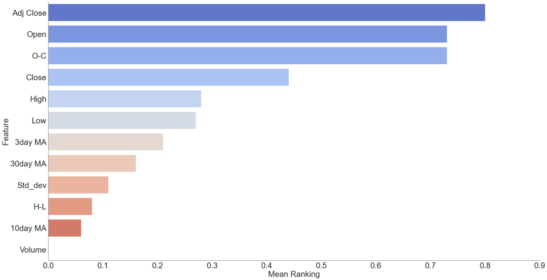 step int or float, default=1 如果大于或等于1,那么'step'对应于每次迭代要删除的(整数)特征数。如果在(0.0,1.0)范围内,则'step'对应于每次迭代中要删除的特性的百分比(向下舍入)。verbose int, default=0 控制输出的冗长。importance_getter str or callable, default='auto' 如果是'auto',则通过估计器的'coef_'或'feature_importances_'属性使用特征重要性。lr = LinearRegression(normalize=True ) lr.fit(X,Y)# 当且仅当剩下最后一个特性时停止搜索 rfe = RFE(lr, n_features_to_select=1 , verbose =3 ) rfe.fit(X,Y) ranks["RFE" ] = ranking(list(map(float, rfe.ranking_)), colnames, order=-1 ) Fitting estimator with 12 features. ... Fitting estimator with 2 features. RFECV Sklearn提供了 RFE 包,可以用于特征消除,还提供了 RFECV ,可以通过交叉验证来对的特征进行排序。 # 实例化估计器和特征选择器 svr_mod = SVR(kernel="linear" ) rfecv = RFECV(svr_mod, cv=5 )# 训练模型 rfecv.fit(X, Y) ranks["RFECV" ] = ranking(list(map(float, rfecv.ranking_)), colnames, order=-1 )# Print support and ranking print(rfecv.support_) print(rfecv.ranking_) print(X.columns)LarsCV 最小角度回归模型(Least Angle Regression)交叉验证。 # 删除第二步中不重要的特征 # X = X.drop('sex', axis=1) # 实例化 larscv = LarsCV(cv=5 , normalize=False )# 训练模型 larscv.fit(X, Y) ranks["LarsCV" ] = ranking(list(map(float, larscv.ranking_)), colnames, order=-1 )# 输出r方和估计alpha值 print(larscv.score(X, Y)) print(larscv.alpha_)以上是两个交叉验证,在对特征重要性要求高时可以使用。因运行时间有点长,这里大家可以自行运行得到结果。 创建特征排序矩阵 r = {}for name in colnames: r[name] = round(np.mean([ranks[method][name] for method in ranks.keys()]), 2 ) methods = sorted(ranks.keys()) ranks["Mean" ] = r methods.append("Mean" ) print("\t%s" % "\t" .join(methods))for name in colnames: print("%s\t%s" % (name, "\t" .join(map(str, [ranks[method][name] for method in methods])))) Lasso LinReg RF RFE Ridge rlasso/Stability Mean Open 1.0 1.0 0.02 0.91 0.47 1.0 0.73 High 0.14 0.0 0.1 0.36 0.06 1.0 0.28 Low 0.02 0.0 0.08 0.73 0.05 0.76 0.27 Close 0.14 0.0 0.64 0.55 0.32 1.0 0.44 Adj Close 0.02 1.0 1.0 0.82 1.0 0.99 0.8 Volume 0.0 0.0 0.0 0.0 0.0 0.0 0.0 H-L 0.0 0.0 0.0 0.45 0.01 0.0 0.08 O-C 0.85 1.0 0.0 1.0 0.53 1.0 0.73 3day MA 0.0 0.0 0.0 0.27 0.01 1.0 0.21 10day MA 0.0 0.0 0.02 0.09 0.0 0.27 0.06 30day MA 0.0 0.0 0.0 0.18 0.0 0.75 0.16 Std_dev 0.0 0.0 0.0 0.64 0.01 0.0 0.11 绘制特征重要性排序图 将平均得到创建DataFrame 数据框,从高到低排序,并利用可视化方法将结果展示出。这样就一目了然,每个特征重要性大小。 meanplot = pd.DataFrame(list(r.items()), columns= ['Feature' ,'Mean Ranking' ])# 排序 meanplot = meanplot.sort_values('Mean Ranking'