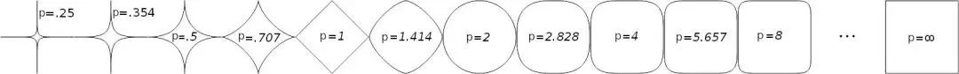 的范围是[1,∞)[1,∞)。pp在(0,1)(0,1)范围内定义的并不是范数,因为违反了三角不等式。根据pp的变化,范数也有着不同的变化,借用一个经典的有关P范数的变化图如下: 上图表示了pp从0到正无穷变化时,单位球(unit ball)的变化情况。在P范数下定义的单位球都是凸集,但是当00<p<1时,在该定义下的unit ball并不是凸集(这个我们之前提到,当0