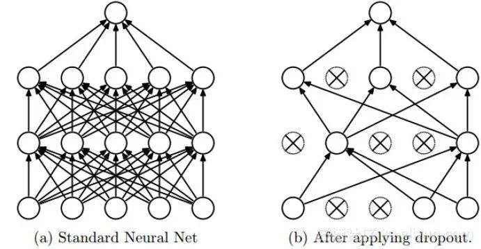 Dropout是深度学习中经常采用的一种正则化方法。它的做法可以简单的理解为在DNNs训练的过程中以概率pp丢弃部分神经元,即使得被丢弃的神经元输出为0。Dropout可以实例化的表示为下图:我们可以从两个方面去直观地理解Dropout的正则化效果:在Dropout每一轮训练过程中随机丢失神经元的操作相当于多个DNNs进行取平均,因此用于预测时具有vote的效果。