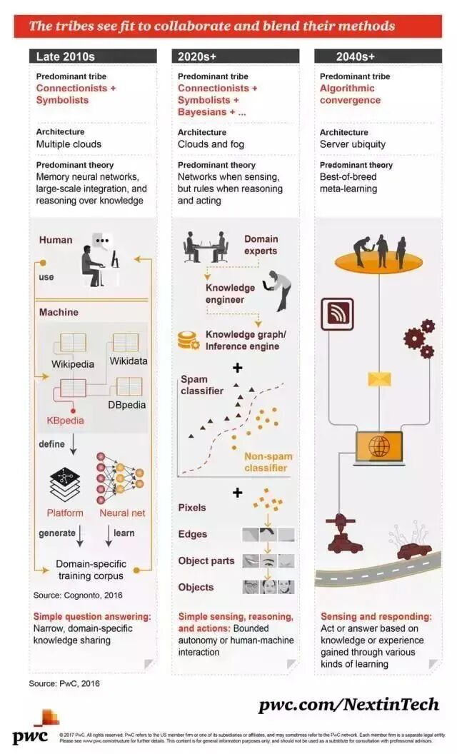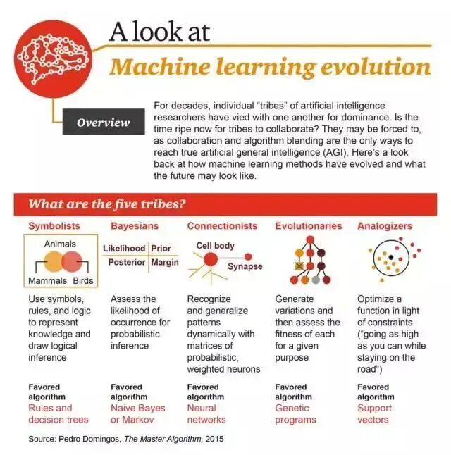 几十年来,人工智能研究者的各个「部落」一直以来都在彼此争夺主导权,参阅机器之心文章《华盛顿大学教授 Pedro Domingos:机器学习领域五大流派(附演讲 ppt)》。现在是这些部落联合起来的时候了吗?他们也可能不得不这样做,因为合作和算法融合是实现真正通用人工智能(AGI)的唯一方式。这里给出了机器学习方法的演化之路以及未来的可能模样。