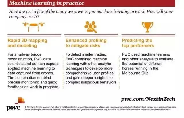 快速三维地图测绘和建模:要建造一架铁路桥,PwC 的数据科学家和领域专家将机器学习应用到了无人机收集到的数据上。这种组合实现了工作成功中的精准监控和快速反馈。 增强分析以降低风险:为了检测内部交易,PwC 将机器学习和其它分析技术结合了起来,从而开发了更为全面的用户概况,并且获得了对复杂可疑行为的更深度了解。 预测表现最佳的目标:PwC 使用机器学习和其它分析方法来评估 Melbourne Cup 赛场上不同赛马的潜力。